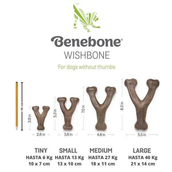 Benebone Wishbone es un juguete para perros con forma de hueso, fabricado en Estados Unidos con nylon duro y aromatizado en su interior con tocino para satisfacer el instinto de masticación de tu perro. Tu perro sentirá el aroma en el interior y comenzará a roer, dando entretención y ayudando a su salud dental.